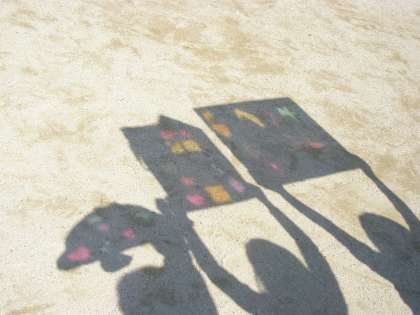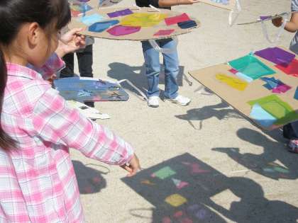 今日は運動場に出て,自分の作品に光を当てて,地面に映ったいろんな形や色を楽しみました。