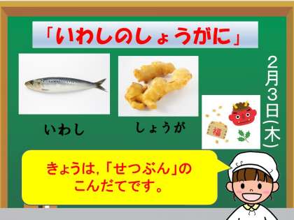 今日の給食は,節分の行事献立で,「麦ごはん・牛乳・いわしの生姜煮・関東に・いり豆」でした。