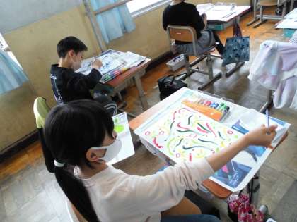 絵の具を使って,いろいろな色で点や線を描きました。