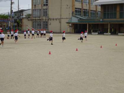 今日は,運動場で体育を行いました。コーンめがけて,走ったりスキップしたり,かにさん歩きをしたりしました。