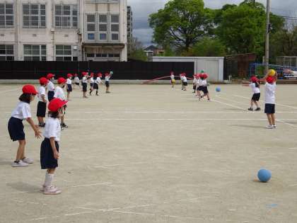 その次は,友達と一緒にボールを使ってパスをしました。クラスの友達とともに,一生懸命,体を動かすことができました。「楽しかった。」「いい汗をかいたな〜。」と子どもたちも,笑顔いっぱいでした。