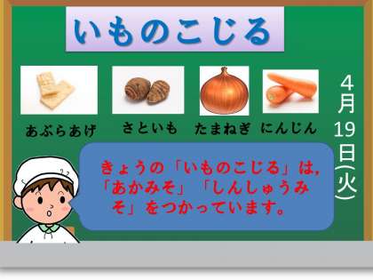 今日の「いものこ汁」は,里芋・油揚げ・玉ねぎ・にんじんを使って,「赤味噌」「信州味噌」の合わせ味噌にして仕上げています。