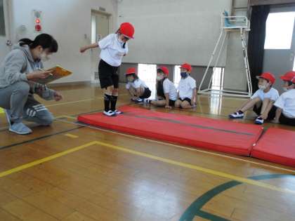 今日は,新体力テストの立ち幅跳びに挑戦しました。遠くまで跳べるように,しっかりと手を振ったり,ひざを曲げて着地したり,一生懸命に取り組むことができました。