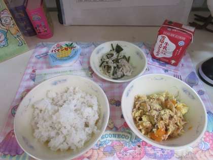 今日の給食は,沖縄料理で「麦ごはん・牛乳・油揚げのチャンプル・クーブイリチー・パインゼリー」でした。