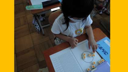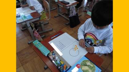 算数の学習では,10個のおはじきを円の中をねらって弾き,入った数と入らなかった数を調べました。友達と結果を比べる中で,10の構成には「8と2」や「6と3」など,いくつかのパターンがあることに気付くことができました。