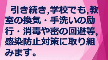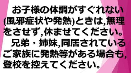 春は,日々の寒暖差や,低気圧と高気圧が頻繁に入れ替わる気圧変動が大きい季節です。引き続き,ご家庭でも,毎日の健康観察や体調管理に努めていただきますよう,お願いいたします。