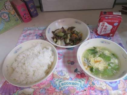 今日の給食は,「ごはん・牛乳・焼肉・中華コーンスープ」でした。「焼肉」には,ピーマンを入れました。子どもたちには苦手なピーマンですが,1年生も一口は頑張って食べていました。