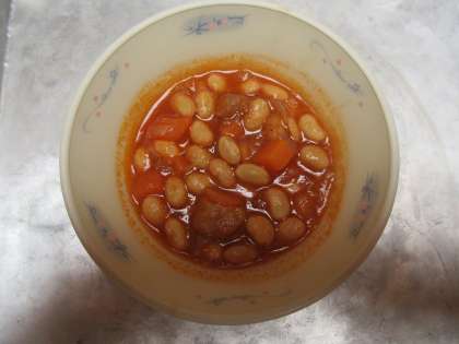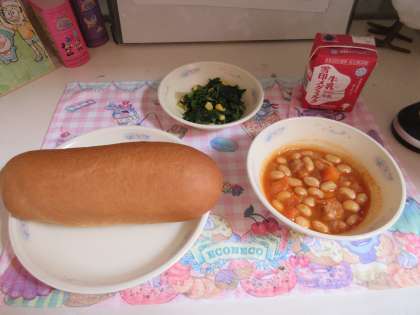 今日の給食は,「黒糖コッペパン・牛乳・ポークビーンズ・ほうれん草のソテー」でした。「ポークビーンズ」は,大豆,豚肉,野菜をトマトでじっくり煮込みました。