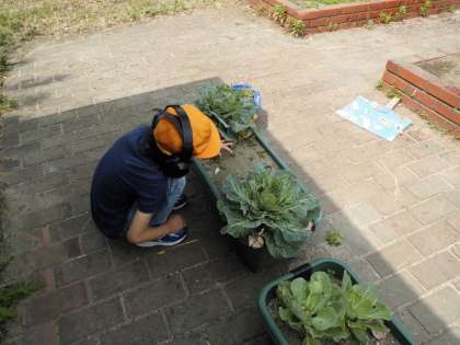 4くみで育てているキャベツがかなり大きくなってきました。いつも水やりや雑草抜きを頑張っている児童達の努力がもうすぐ実を結びそうです。