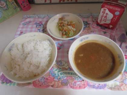 今日の給食は,「ごはん・牛乳・チキンカレー・ツナとキャベツのソテー」でした。チキンカレーは,子どもたちに人気の献立です。給食室からカレーのいい匂いが,朝から漂ってきました。さっぱりした「ツナとキャベツのソテー」との組み合わせがよかったですね。