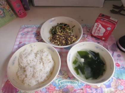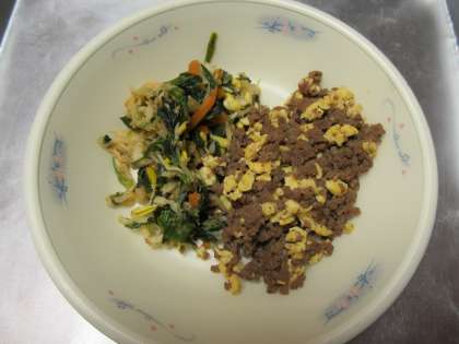 今日の給食は,「麦ごはん・牛乳・ビビンバの具(にくたまご)(ナムル)・わかめスープ」でした。