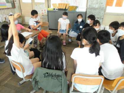 今日は学級活動の時間に,スポーツフェスティバルで行う「台風の目」の作戦会議を行いました。2レースあるので,1レースずつ,2グループに分かれてどうすれば勝つことができるのか,話し合いを行いました。「こうしたら速くなると思う。」,「今度試してみて,また考えよう!」と活発に意見を交わしていました。