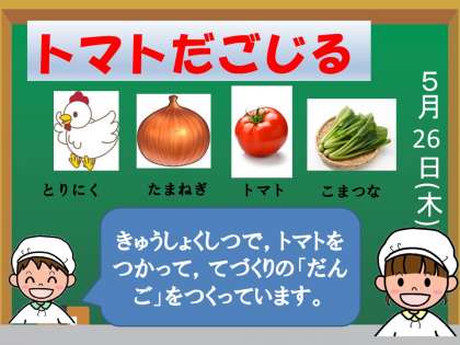 「トマトだご汁」は,九州地方でよく食べられる料理で,「だご」とは「だんご」のことです。給食では,手作りの団子や汁にもトマトを使っています。手作りの団子は,少しピンク色でもちもちしていました。