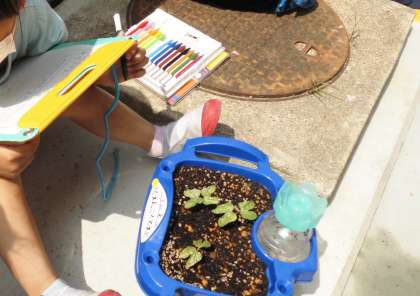 「やったぁ!芽が出た。」と,子どもたちも大喜びです。「ちょうちょうみたいな形をしているね。」,「よく見ると,くきの部分が赤いよ。」,「種の皮がついたまま,芽が出てきました!」と,驚きや発見がいっぱいでした。子どもたちは,毎日の水やりも頑張っています。これから,どのように生長していくか,子どもたちも楽しみにしています。