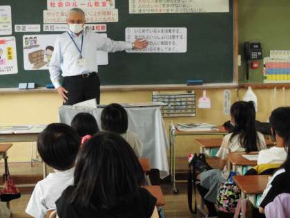 学校や社会でのルールやきまりがどうしてあるのか,破ってしまうとどうなるのか,みんなが気持よく過ごすためには一人一人が正しいことと悪いことをしっかり判断し,正しいことを行うことが大切だ,というお話がありました。