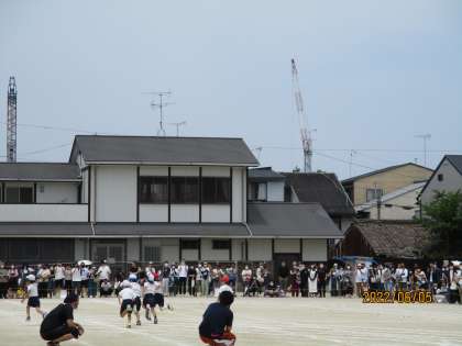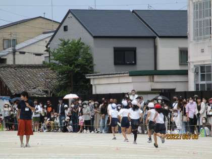 4年生・2年生・6年生の順番で徒競走を行いました。4年生は昨年の50mから80mと距離がのびました。どの学年も全力で走りきりました。