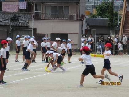 4年生の団体競技は「グレイトタイフーン2022」です。チームで作戦を考えたり,練習したりしたことを発揮していました。応援が子どもたちの力になっていました。