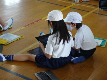 3年生は,マット運動を行っています。今日は,体育館のスクリーンに技の見本を動画で流しながら,学習しました。タブレット端末で撮影した自分の動きを何度も確かめて,比較しながら練習していました。