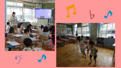 1年生の音楽では,「しろくまのジェンカ」や「かたつむり」,「ぶんぶんぶん」などの曲に合わせて,手拍子をしたり,体を動かしてリズムをとったりしています。