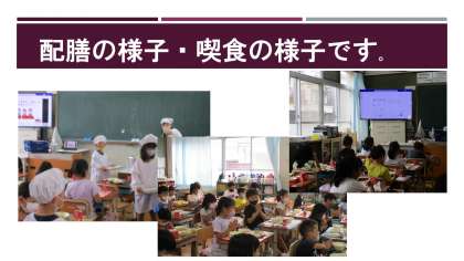 今日から、二学期の給食が始まりました。一年生はどんな様子かなと教室をのぞきました。給食当番は、配膳盆に4つずつ置いてもらい、一方通行で進み、当番以外の座っている友だちに取ってもらっていました。感染症対策もばっちり覚えていました。