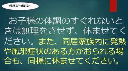 夜は早く寝て、明日に備えることができるようにご家庭でも声かけをお願いします。体調が悪いときは、無理をせず休ませてくださいね。