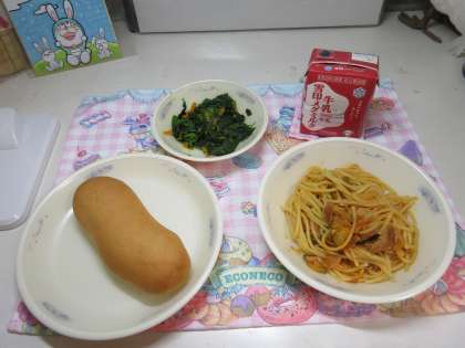 今日の給食は、「小型コッペパン・牛乳・イタリアンスパゲティ・ほうれん草のソテー」でした。