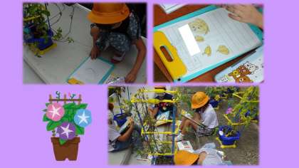 生活科の学習では、朝顔の花がしおれたあと、種子ができている所を観察しました。「花の無くなったところが、どんどん大きくなっているね。」「たまねぎみたいな形の実の中に、種が5個ぐらい入っていました。」「実が緑の時は、種ができている途中なのかな?」と、様々なことに気付きながら観察することができました。