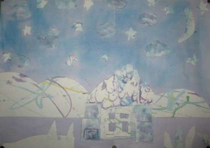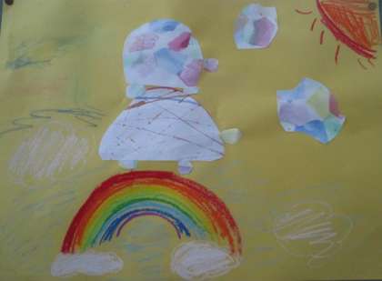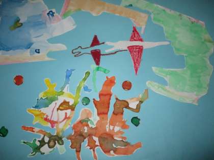 絵の具の使い方を試し、できた模様で絵を描きました。様々な用具を使うことで、一人一人違った模様ができました。つくりだす喜びを味わいながら、色や形などに関わり楽しく活動できた様子が作品から伝わってきます。