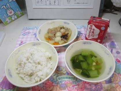 今日の給食は、「麦ごはん・牛乳・プリプリ中華炒め・豆腐と青菜のスープ」でした。プリプリ中華炒め」は、大人気のメニューです。名前の由来でもあるように、こんにゃくやうずら卵・しいたけなどのプリプリした食感が楽しめる料理です。