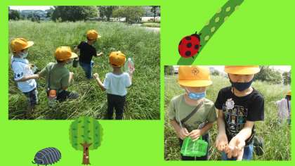 今日は、西寺公園へ行き、虫探しをしました。草をかき分けたり、木の近くをよく見たりするとバッタやキリギリスなどがたくさんいました。子どもたちも、「自分でつかまえられたよ。」「たくさん飛んでいたよ。」と嬉しそうに話してくれました。