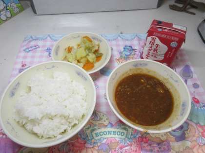 今日の給食は、「ごはん・牛乳・キーマカレー・野菜のホットマリネ」でした。