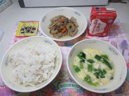 今日の給食は、「麦ごはん・牛乳・筑前煮・かきたま汁・黒大豆」でした。