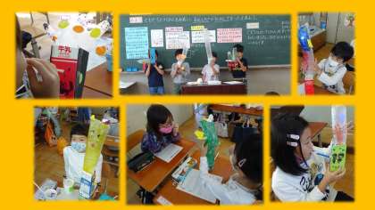 図画工作「にょきにょきとびだせ」では、袋が膨らむ仕組みを作り、その動きを試しながら、作りたいものを考えました。