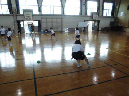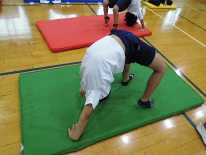 「マット運動」では、転がりや回転、体の保持など各自の目標にそって励んでいます。「転がしドッチボール」は、回を重ねるごとに、投げる、逃げるともに上達しています。