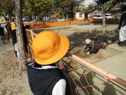 西寺公園の発掘調査の様子を見に行きました。掃除機で砂や小石を吸いながら丁寧に地面を掘っているところを見せてもらいました。