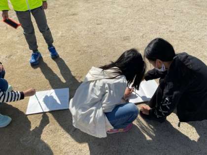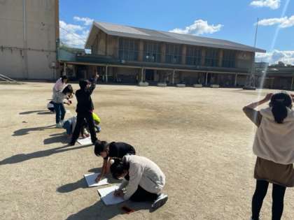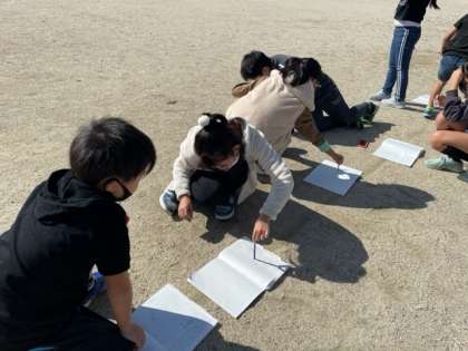 かげは太陽の光を何かを遮ることでできることに気付いた子どもたちは,時間が変わるとかげのようすはどうなるのかを観察して確かめました。
