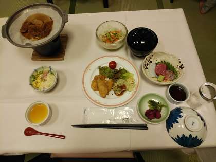 夕食です。食事係さんのクイズのあと、みんなで元気に「いただきます!」子どもたちは、ごちそうをおいしそうに食べました。