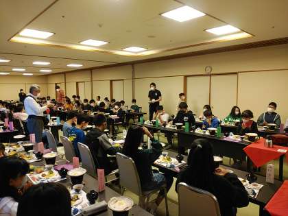 部屋のメンバーで協力して布団を片付けた後、朝食を食べています。