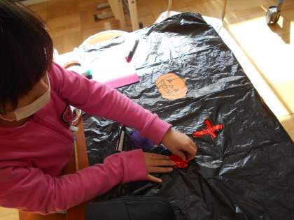 黒のビニール袋を選ぶ人、透明の袋を選ぶ人、黒と白の2枚の袋を重ねる人など各自工夫しました。下地に、より映える色づくりや飾りを考えて、楽しいカラフルな「ハロウィンマント」ができました。