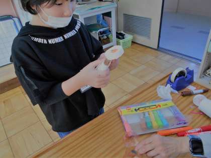 人形部分は、各自で考え「サンタとトナカイ」、「ウサギ」、「ライオン」などでした。紙コップの周りも、飛び出す部分に関連してクリスマスらしい模様や、ニンジン、森林など各自工夫しました。最後に持ち寄って楽しく試し遊びをしました。