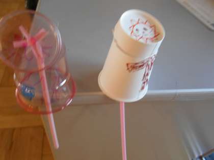 作り方は、紙コップの上をふたのように一部をつないで残るように切ります。そこの中に、「曲がるストロー」をつけて下から動かすと、ふたにつけた人形の絵が飛び出します。