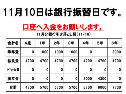 振替ができますように。先日までに、皆様、残高をお確かめいただき、現金納入になりませんようにどうぞご協力ください。