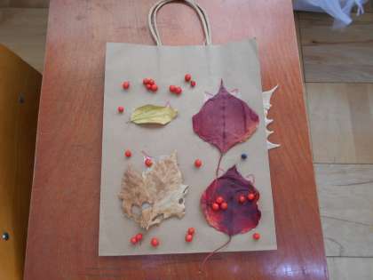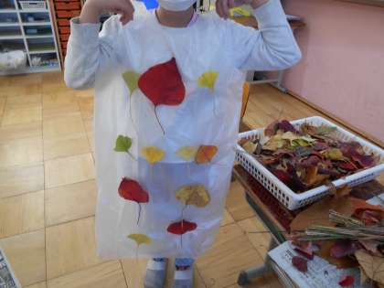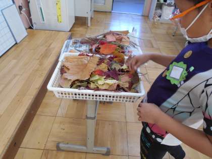 低学年の「生活科」では、「秋見つけ」をしています。本日は木の葉や木の実をアレンジした袋や服作りを楽しみました。