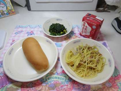 今日の給食は、「小型コッペパン・牛乳・きのこのスパゲティ・ほうれん草のソテー」でした。
