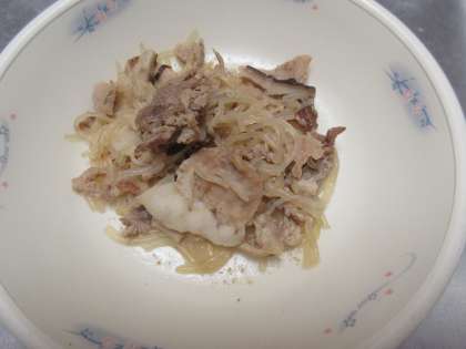 地球にやさしい献立…干ししいたけを水でもどしたときに出る『もどし汁』には、栄養やうま味が多く含まれています。「豚肉とこんにゃくの炒め煮」に、しいたけとそのもどし汁を使っています。