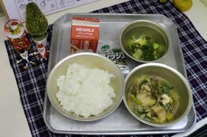 今日の献立は,「ごはん,牛乳,すき焼き風煮,ブロッコリーのおかか煮,じゃこ」でした。