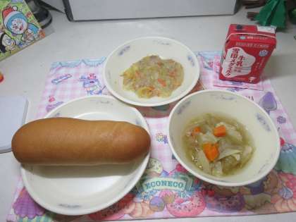 今日の給食は、「黒糖コッペパン・牛乳・ペンネの豆乳グラタン・野菜のスープ煮」でした。