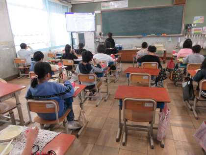 給食時間に各教室を訪問しました。「ペンネの豆乳グラタン、おいしい。」と絶賛してくれました。寒いときに、温かいグラタンとってもおいしかったね。