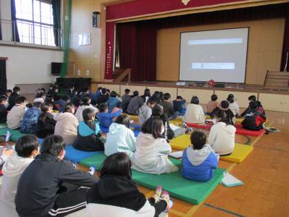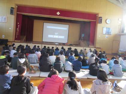 6年生は体育館で劇団四季のこころの劇場『人間になりたかった猫』の動画視聴を行いました。