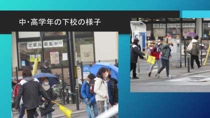 下校は、授業時間の同じ1〜2年と3年〜6年で時間を合わせて一斉に帰りました。午後2時半の学校の南にある歩道橋には、雪が残ったままで、段差も分からないところが部分的にありました。今日は、教員といっしょに安全に気を付けて信号を渡って下校しました。